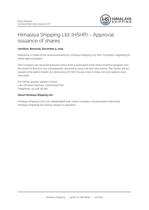 In August 2025, Himalaya Shipping Ltd. (“Himalaya,” or the “Company”) achieved average time charter equivalent (“TCE”) earnings of approximately US$36,700 per day, gross1, including average daily scrubber benefits on twelve vessels of approximately US$1,300 per day. The Company’s six vessels trading on fixed time charters earned approximately US$35,300 per day, gross, including average daily scrubber benefits. The Company’s six vessels trading on index-linked time charters earned approximately US$38,100 per day, gross, including average daily scrubber benefits.