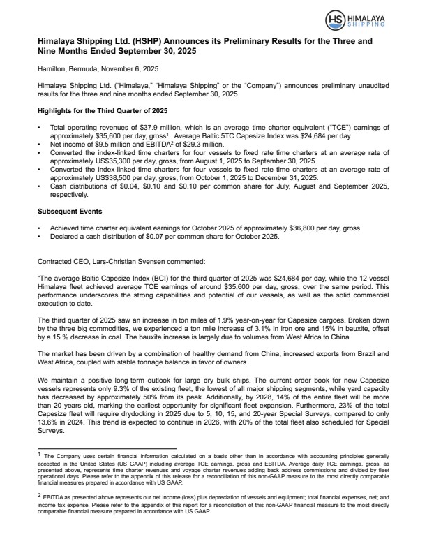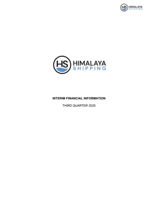 Himalaya Shipping Ltd. (“Himalaya,” “Himalaya Shipping” or the “Company”) announces preliminary unaudited results for the three and nine months ended September 30, 2025.
